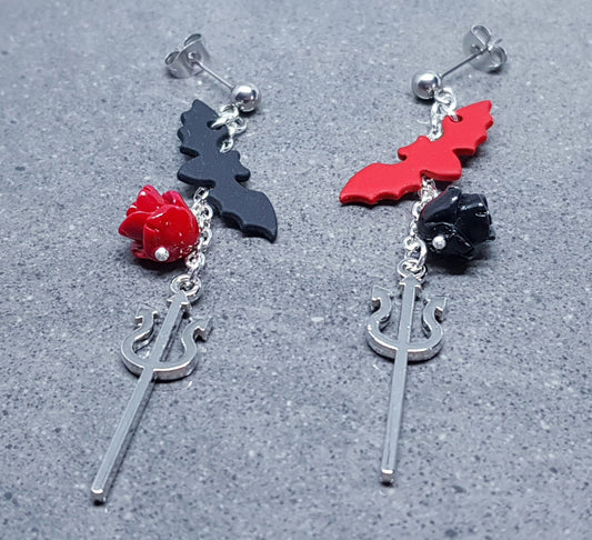 Bat Earrings, Surgical Steel Studs, Autumn Fall Earrings, Halloween Earrings, Halloween Party, Hallows Eve, Red and Black Rose