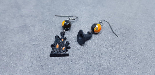 Haunted House Earrings, Hypoallergenic Ear Wires, Autumn Fall Earrings, Natural Fire Crackle Agate Beads, Halloween Earrings, Hallows Eve