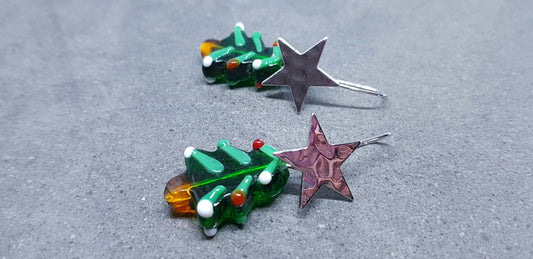 Glass Christmas Tree Earrings, Glass Christmas Tree Jewellery, Nickel Free Platinum Plated Star Ear Wires, Festive Earrings