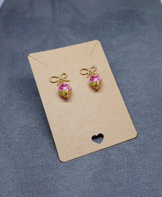 Glass Gold Rose Earrings, Glass Pearl Earrings, Brass bow studs, Pink Rose Jewellery, Vintage Style Earrings