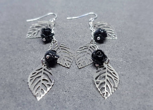 Rose Dangle Earrings, Hypoallergenic Ear Wires, Leaf Earrings, Rose Earrings, Vintage Style Earrings