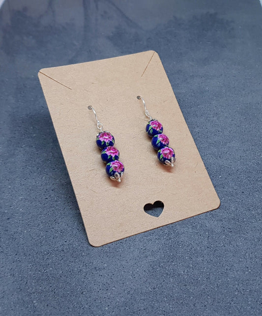 Royal Blue Glass Pearl Earrings, Vintage Rose Earrings, Glass bead Jewelry, Blue Earrings, Hypoallergenic