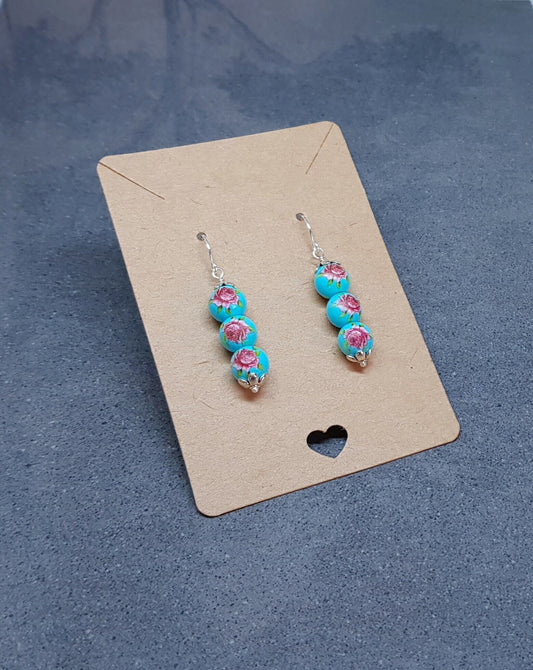 Blue Glass Pearl Earrings, Vintage Rose Earrings, Glass bead Jewelry, Pale blue Earrings, Hypoallergenic