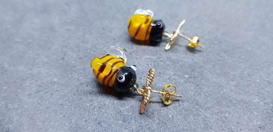 Glass Bee Earrings, Bee Earrings, Brass bow studs, Bumble Bee Earrings, Bee Jewelry