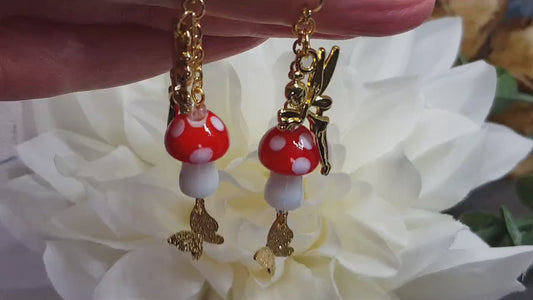 Glass Mushroom Earrings, Fairy Earrings, Butterfly Earrings, Glass Jewelry, Hypoallergenic Ear Wires, Toad Stool Earrings, Gold Earrings